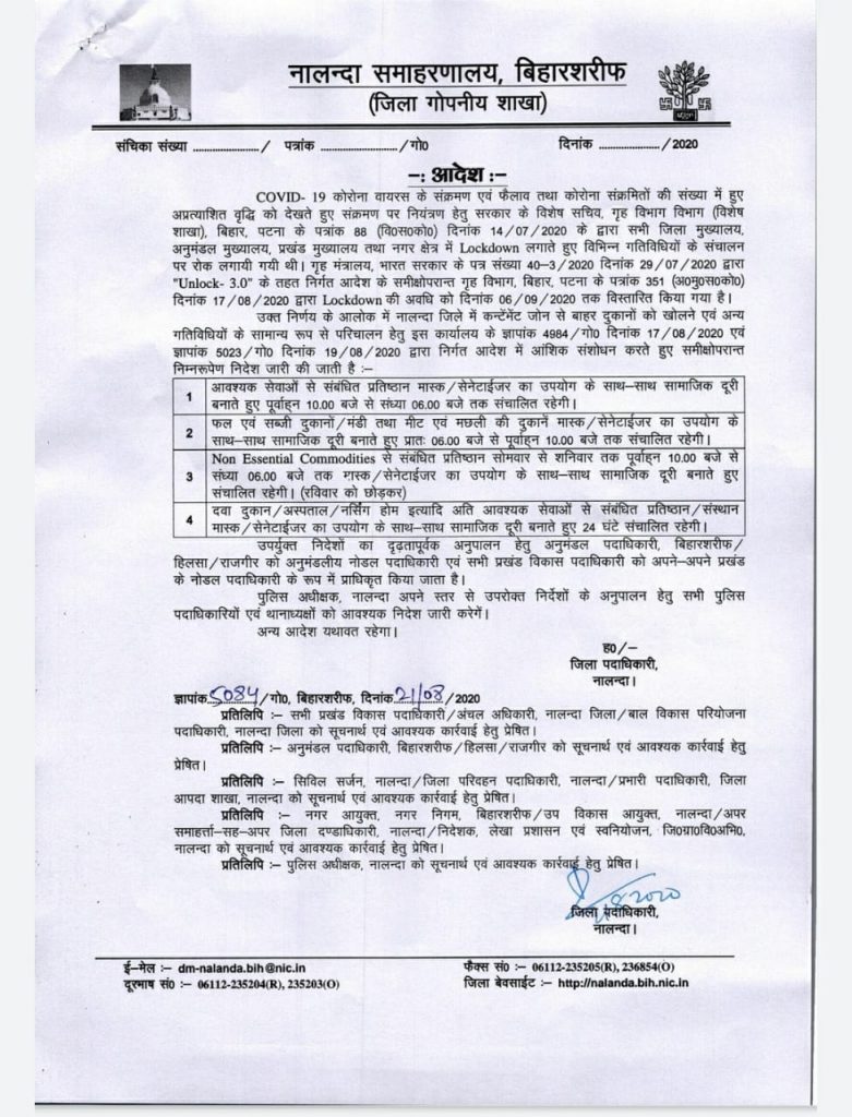 नालंदा के जिलाधिकारी योगेंद्र सिंह ने एक बार फिर जिला में लॉकडाउन के नियम में बदलाव किया है | नए जारी आदेश में दुकानों के लिए नई समय-सारिणी जारी की गयी है। ताकि अनावश्यक भीड़ को नियंत्रित किया जा सके। दुकानों को सामग्रियों के आधार पर पहले तीन भागों में बांटा गया था | लेकिन इस बार चार भागों में विभाजित किया गया है। इनके खुलने और बंद होने का अलग-अलग समय दिया गया है।